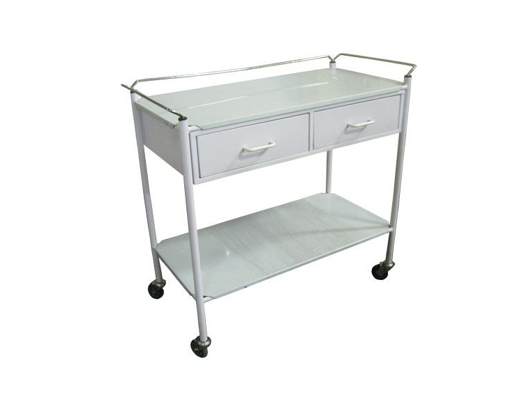 White epoxy coated frame, two drawers and one shelf, and stainless steel top.
