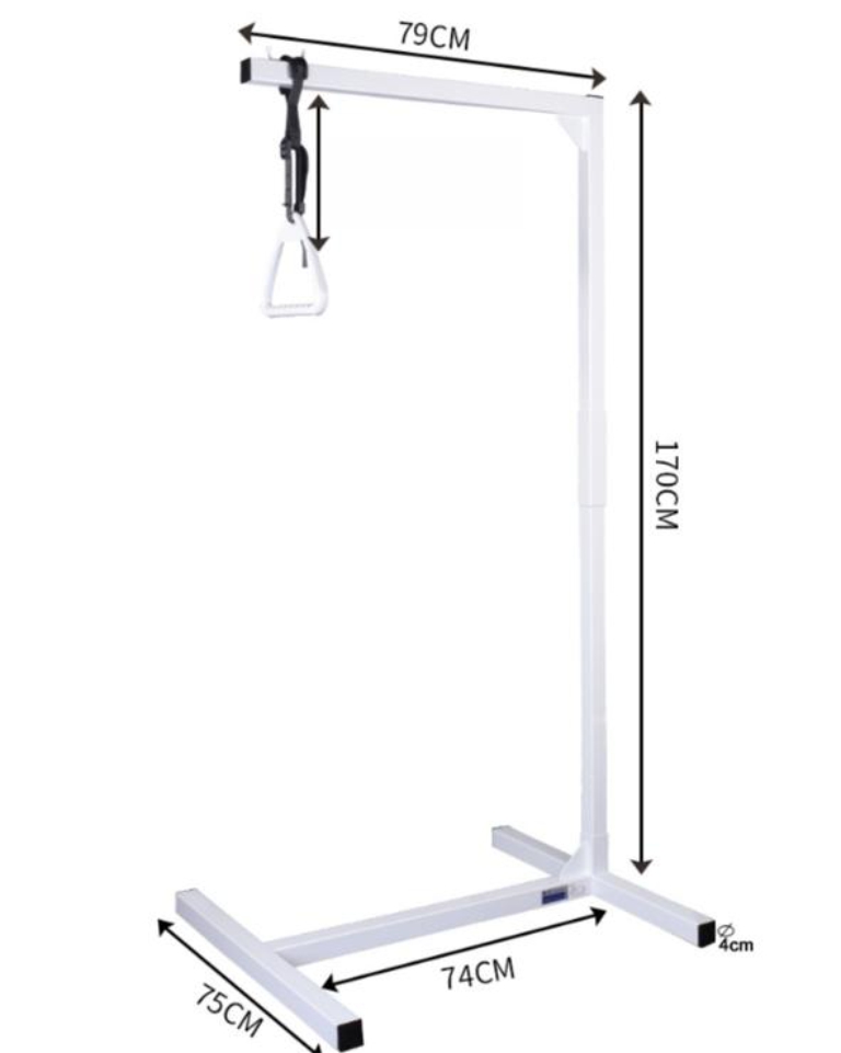 Freestanding lifting pole for patient 0808195 to raise the user from supine to sitting position, the base is placed on the ground and the hanger is attached to it.