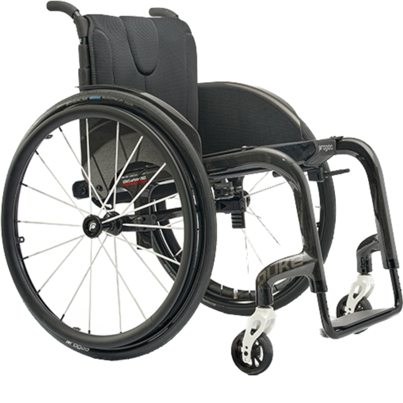 A wheelchair made up of two frames in carbon-fibre monocoque with differentiated section shapes to confer resistance and reactivity. Design and characteristics of a made-to-measure wheelchair while keeping the chance of final adjustment