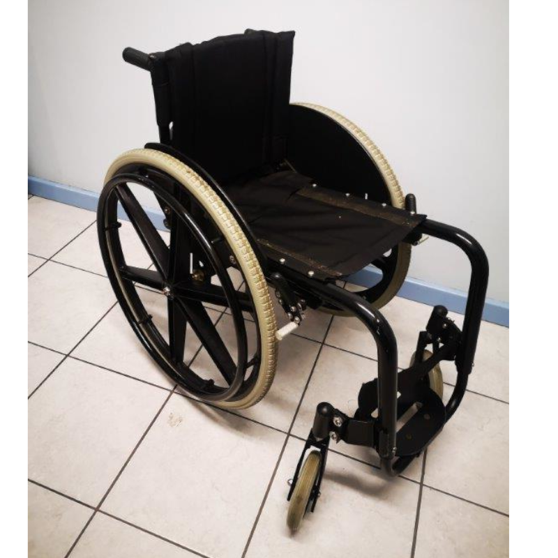 This Rollability Jag is a rigid wheelchair, manufactured in South Africa. It has a black frame with 6″ castors, solid tyres and a tension adjustable backrest.