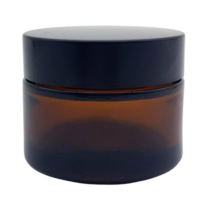 Complete set of amber glass jar with shiny black cap and inner lid shive.